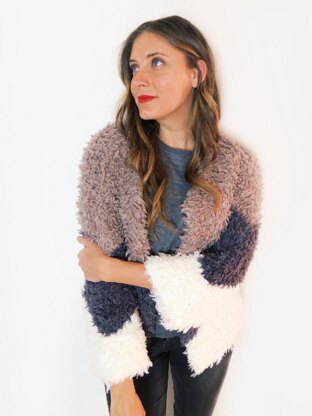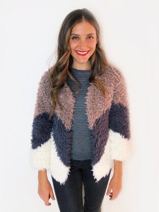 If you’ve been searching for the snuggliest lightweight faux fur jacket on Earth, you’ve come to the right place. Featuring a chic chevron design, the Wolfpack Jacket is a blend of super soft merino/alpaca yarn and a faux fur yarn that may even be cozier than the real thing! The Wolfpack Jacket is closed with 4 hooks and eyes down the center front.