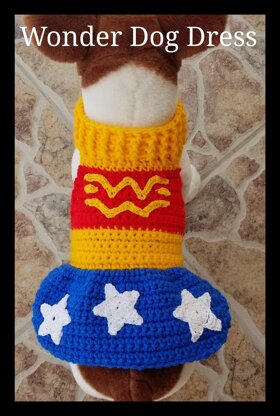 This is a cute little Wonder Puppy/Dog Sweater in 4 different sizes. So cute and made with simple sts. Pattern is a step-by-step written crochet pattern with many pictures to help you along the way. Sweater features Red, White, Gold and Blue theme along with a "W W" logo and stars. Cute sweater for that perfect pooch.