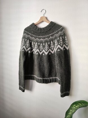 The Woodland Hills Sweater is worked from the top down and starts with a double border rib collar, after which short rows are used to shape the neck. It continues with the colorwork section across the yoke, and when the yoke is complete the sleeves and body are finished separately. The sweater also has a colorwork motif at the end of the sleeves and the body. Inside the pattern there are two variations of the main motif, so this allows you to choose the one you prefer.
