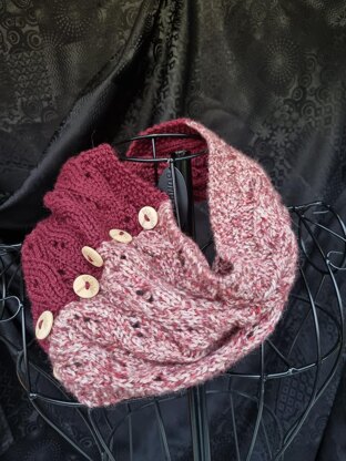 The cowl is knitted in Aran weight yarn and, to add interest, I decided to knit half in a beautiful solid burgundy and the other half in an equally beautiful speckled “berry-like” variegated. Why not mix and match a few remnants of yarn to make a colourful, warm accessory and do a little stash-busting? Or maybe a single colour is more your style – the choice is yours. The stitch pattern is 8 stitches by 16 rows and the pattern is repeated 4 times. It’s a relatively simple lace pattern that creates a mock cable, but if you prefer you can place a marker between each 8-stitch repeat just to keep a check on your stich count and yarn overs as well as between the edging and central pattern, as indicated in the pattern below. It makes a good relaxing knit for an experienced lace knitter, but could also be a good start for a first lace knit project