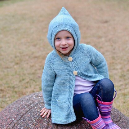 Like most small children, my daughter has a tendency to collect little treasures during our walks. Even in the winter, when there are no dandelions to pick or inchworms to scoop up, she manages to find plenty to fill her pockets – birds’ feathers, leaves with interesting shapes, and small pebbles that somehow stand out from the rest. I wanted to knit her a coat especially for our winter walks – one that would combine my love for vintage details with her need for a warm sweater. Knit entirely from the top down, the coat starts with a hood that’s knit flat and grafted together later. The classic raglan shape flows into an a-line body, and the sweater is edged with icord to give it a finished look. An optional garter stitch tab positioned just above the back pleat give the coat a polished look. The pattern includes a step-by-step photo tutorial for finishing the pleat.