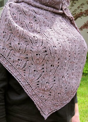 This lightweight triangular shawl incorporates a bobble lace stitch that comes to us from Japan. It is knit top down, and the stitches cause a pretty and delicate scallop at the neckline. The Bobble edging makes this triangular shawl truly unique. While the shawl looks difficult to knit, it is not hard, and is suitable for Intermediate knitters.