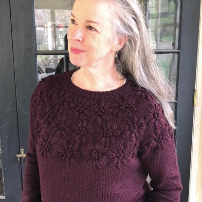 This top-down sweater is designed for embroidery, with a deeper than traditional yoke, with a recommended fit of 4 to 6" of positive ease. Embroidery worked at a tension even with the fabric does not affect final size.