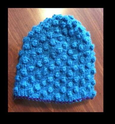 Hat is knit in the double knit stitch in a round. It has bobbles on the outside and is plain stockinet stitch on the inside.