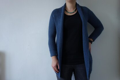 “Courie in” is a Scottish phrase meaning to “snuggle up” - and it’s the perfect name for this oversized, supremely warm, wrap front cardigan. In a lighter weight yarn than the original version, but still ideal for nestling into with a mug of cocoa on a cold day. This cardigan has a slightly unusual construction. Sleeves are knitted first from cuff to centre back, then both sleeves are joined with a three needle bind off. Stitches are picked up at the bottom edge from underarm to underarm and worked down to the hem to form the back. Then stitches are picked up round the front to form the garter stitch wrap front. We include instructions for nine sizes to fit busts from 26” to 60”/65 to 150 cm.
