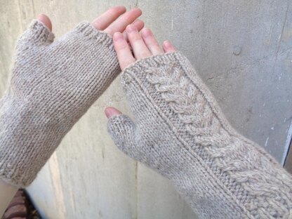 Cozy fingerless gloves with delicate cable details, worked in a soft and natural toned eco merino yarn.