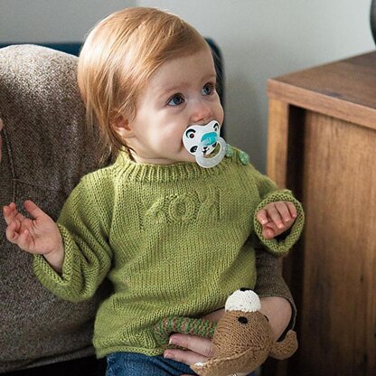 Worked from the bottom up in pieces, this roomy pullover features a shoulder button placket in the smaller sizes for ease of dressing baby.