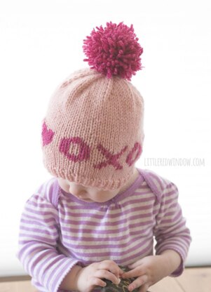 Adorable Valentine's Day Hat with cute XOXO fair isle pattern for babies and toddlers. Requires basic Fair Isle knitting knowledge, includes both chart and written instructions.