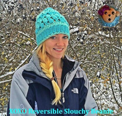 I wanted a hat for a friend that is all about giving X's and O's. WHat better design than a hat stitched LITERALLY with X's and O's??? I present to you the XOXO Slouchy Beanie.