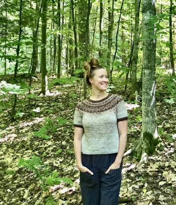 This feminine top down yoke sweater features three colors, positive ease and short sleeves. A perfect little Summer top with a smattering of color work. I love the lo-fi contrast in this one, and due to the small amount of yardage used for the CC’s its a great stash buster.