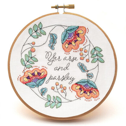 Elegant, sophisticated, snarky... what could be better than that. The gorgeous spring-like mint and peach tones in the Yer Arse and Parsley cross stitch pattern belies the meaning of the text, which is a Scottish insult translating roughly to, "You're talking shit." The phrase can be used to make your own exclamations of frustration more colourful, or for those more sensitive you could say it's an inspirational phrase promoting a healthy whole diet ... This Jacobean-era inspired cross stitch pattern also features sparkling Japan Threads in a glorious copper, as well as shiny copper beads. The pattern comes with a full black and white pattern and a full colour pattern. Model stitched over two on Zweigart 28ct Cashel linen (Antique White). A link to a tutorial for couching is included in the pattern. ADDITIONAL MATERIALS NEEDED: 1 spool of Kreinik 021J (Copper) Japan Thread #7, as well as one pack of Mill Hill 03038 (Antique Ginger) size #11 seed beads. You will also need sewing or embroidery threads that match the colour of the Kreinik threads for couching -- DMC 21 embroidery floss will work for the Copper Japan Thread.