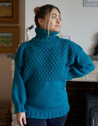 Knitting level – Advanced. (Pattern is worked top down with two separate panels. Panels are seamed together and then the collar and optional sleeves are worked onto the jumper with picked up stitches).