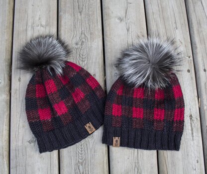 This unisex buffalo plaid hat is knit in the round from brim to crown. The hat can be knit as a beanie or a slouchy hat.