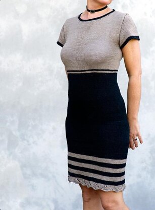 Anleitung für ein schönes Kleid in zwei Farben. Zunächst wird in Runden gestrickt, später teilt man das Strickstück in Vorder- und Rückenteil auf und strickt in Reihen weiter. Detaillierte Anweisungen, Fotos und Schemazeichnungen sind in der Anleitung enthalten. Sie enthält eine englische und eine deutsche Version.