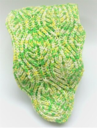 This one-color brioche stitch scarf is knitted in aran weight yarn featuring a large bold leaf design. It is fully reversible with similar bold leaves on the reverse. Both sides have a neat selvedge edge.