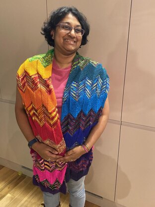 The choice of yarn will affect the size. The purple/silver/blue wrap used 240g of sock/4ply (24 x 10g miniskeins) and measures after blocking 22 inches by 64 inches.