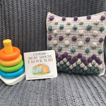 The idea for this pillow came about when I was looking for something fun and functional for my son’s nursery. The bobbles in different colors add a touch of whimsy to the pattern. The dotted bobble section is a bit more modern.