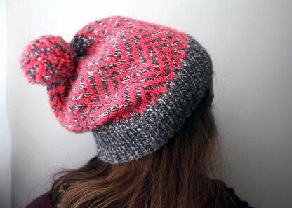 Zigzag is a slouchy hat knit in the round. The pattern uses stranded color-work to create a zigzag stripe effect.