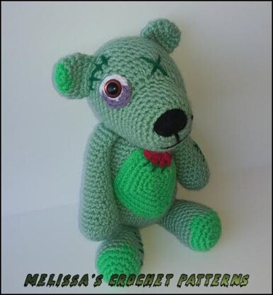 The finished size of your Zombie Bear will be about 11 inches. Your size will vary depending on the yarn you choose, the crochet hook you choose, and your tension while crocheting. I used worsted weight yarn and a size D hook to get my Zombie Bear to 11 inches.