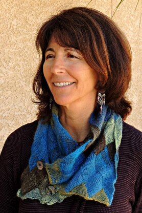 form of a plait and traditionally eaten on Sunday mornings. The name "Zopf" is derived from the shape of the bread, and literally means "braid." This small scarf uses the Entrelac technique to make the look of warm braids with yarn. You can make this pretty little neckwarmer with just one skein of cashmere blend yarn (or other DK wt yarn). Entrelac is French for "inter-laced." The use of short rows creates a woven look which is an appealing use of this self-color blocking yarn. Solids also look nice with technique. I-cord button loops attach to decorative buttons on this short neckwarmer- no buttonholes needed.